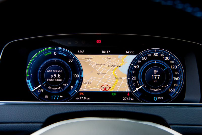 Εσωτερικά, επίσης η εικόνα είναι τυπική ενός Golf και μόνο όταν ανοίξει ο διακόπτης στο τιμόνι καταλαβαίνεις την ουσία του οχήματος. Αναλόγως της εξοπλιστικής έκδοσης, το αυτοκίνητο διατίθεται και με το σύστημα ενημερωδιασκέδασης Discover Pro, με έγχρωμη οθόνη αφής 9,2 ιντσών, όπως και το Active Info Display, τον ψηφιακό πίνακα οργάνων που αντικαθιστά τον κλασικό. Επίσης, για εξοικονόμηση ενέργειας σε κρύο περιβάλλον, διατίθεται προαιρετικά μια αντλία θερμότητας η οποία ζεσταίνει το εσωτερικό εξοικονομώντας έως και 30% ενέργειας, σύμφωνα με τη VW.