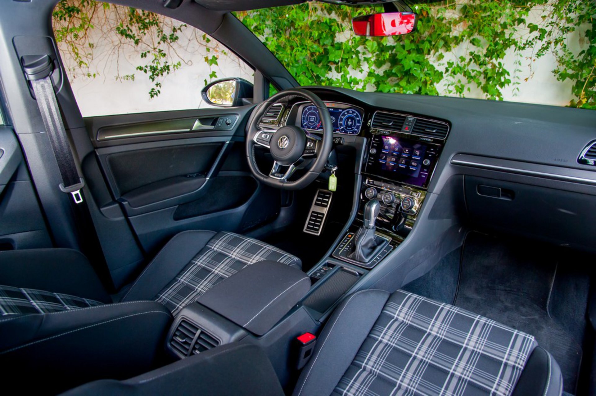 Στο εσωτερικό, τα χαμηλότερα τοποθετημένα καθίσματα (επενδεδυμένα με ταπετσαρία που το πατρόν της παραπέμπει σε αυτό του Golf GTI) παρέχουν καλύτερη πλευρική στήριξη, είναι σχετικά σκληρά σε αίσθηση και συνάδουν το στυλ του οχήματος. Το τιμόνι είναι επίπεδο στο κάτω μέρος του, έχει χοντρή στεφάνη και -εν προκειμένω- διαθέτει μοχλοδιακόπτες για τη αλλαγή των σχέσεων του επτατάχυτου κιβωτίου διπλού συμπλέκτη.