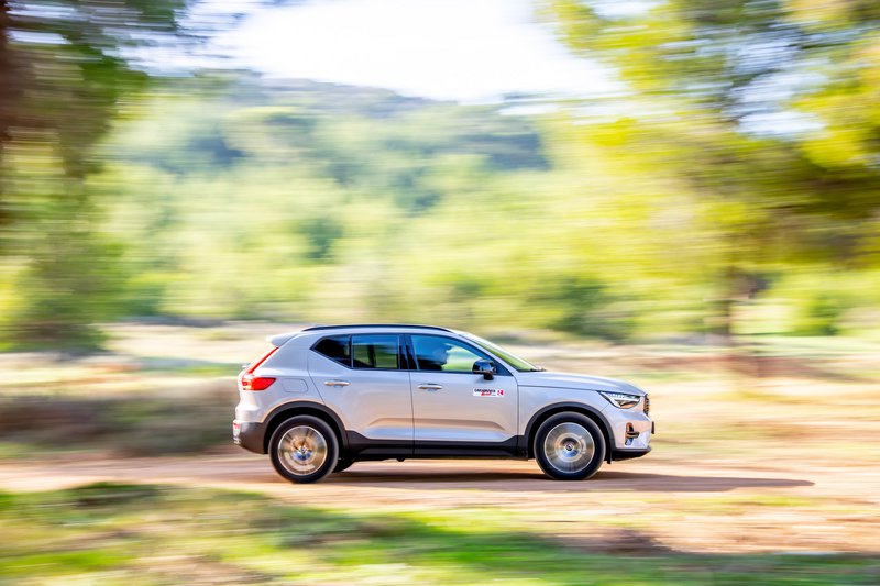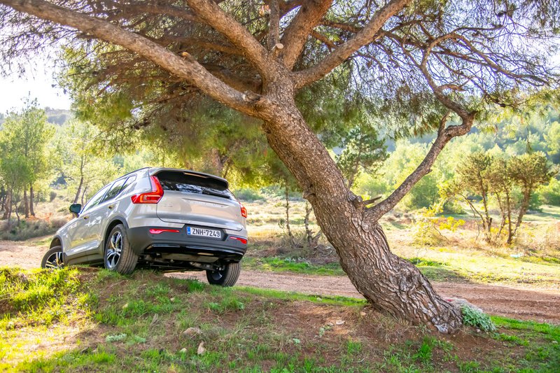 Το κιβώτιο είναι το καλό, αυτόματο 8άρι της Aisin με shift-by-wire που παραμετροποιεί ανάλογα με το πρόγραμμα κίνησης τη λειτουργία του ενώ μέχρι και στο off-road πρόγραμμα δίνει ιδιότητες κοντού (καλό αυτό για κίνηση σε σαθρό έδαφος). Ναι μπορεί να σας φαίνεται περίεργο ΑΛΛΑ: To XC40 είναι ένα κανονικό SUV έστω και δικίνητο, καθόσον και απόσταση 205 mm έχει το πάτωμα από το έδαφος και το ύψος διέλευσης υδάτινου κωλύματος είναι 450 mm. Αν προτιμήσετε ένα ανάλογο σετ ελαστικών θα αποκτήσετε ικανές δυνατότητες μετακίνησης. Για την ώρα, οδηγούμε το αυτοκίνητο δοκιμής με ελαστικά Continental EcoContact 6 235/55-R18 και εντυπωσιαζόμαστε από το εξαιρετικό επίπεδο της ποιότητας κύλισης τόσο σε γαρμπιλάτη άσφαλτο όσο και σε ήπιο off-road ανάγλυφο έχοντας γόνατα εμπρός και πολλαπλούς συνδέσμους πίσω.