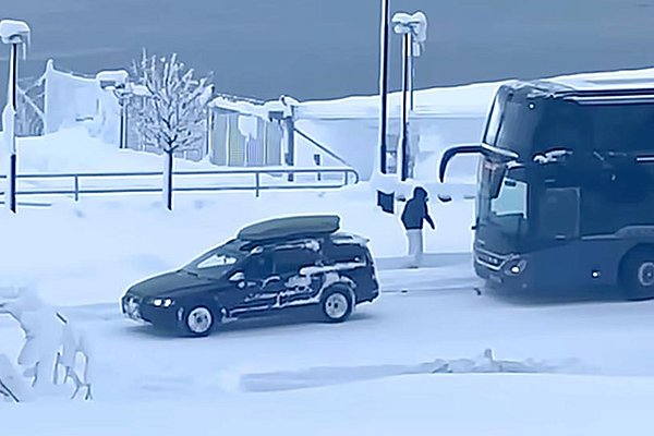 Απίστευτο περιστατικό: ΙΧ ρυμούλκησε διώροφο λεωφορείο που κόλλησε στα χιόνια (video)
