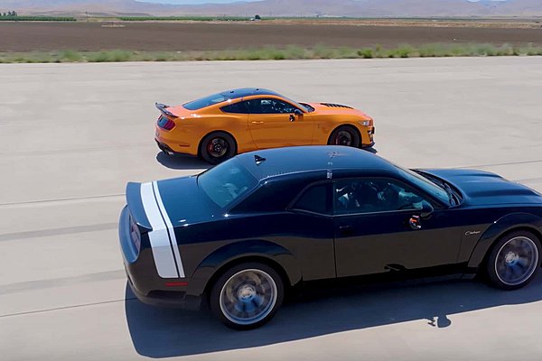 Dodge Challenger Black Ghost εναντίον Ford Mustang GT500 σε drag race που οδηγεί αναστροφή (video)