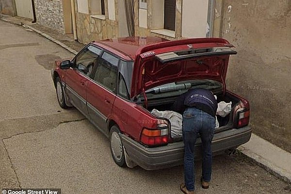 Οι εικόνες, τις οποίες τράβηξε ένα από τα van της Google, δείχνουν έναν άντρα να φορτώνει ένα μεγάλο, λευκό σάκο στο πορτ-μπαγκάζ του αυτοκινήτου.