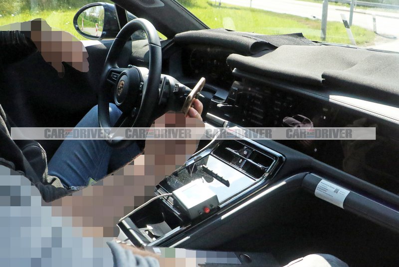 Για πρώτη φορά, η καμπίνα της Panamera του 2024 απαθανατίστηκε από τον φακό. Η πρώτη αλλαγή είναι η έλλειψη του ογκώδους λεβιέ για το αυτόματο κιβώτιο ταχυτήτων. Με μία πιο προσεκτική ματιά θα παρατηρούσε κανείς ότι ο λεβιές ταχυτήτων μοιάζει με... ξυριστική μηχανή και βρίσκεται στα αριστερά του συστήματος ψυχαγωγίας, όπου θα τον βρείτε και στην ηλεκτρική έκδοση της Panamera. Το κουμπί του ηλεκτρικού χειρόφρενου βρίσκεται πάνω από τον λεβιέ και όχι στα δεξιά του, όπως είναι εγκατεστημένο στο Taycan.