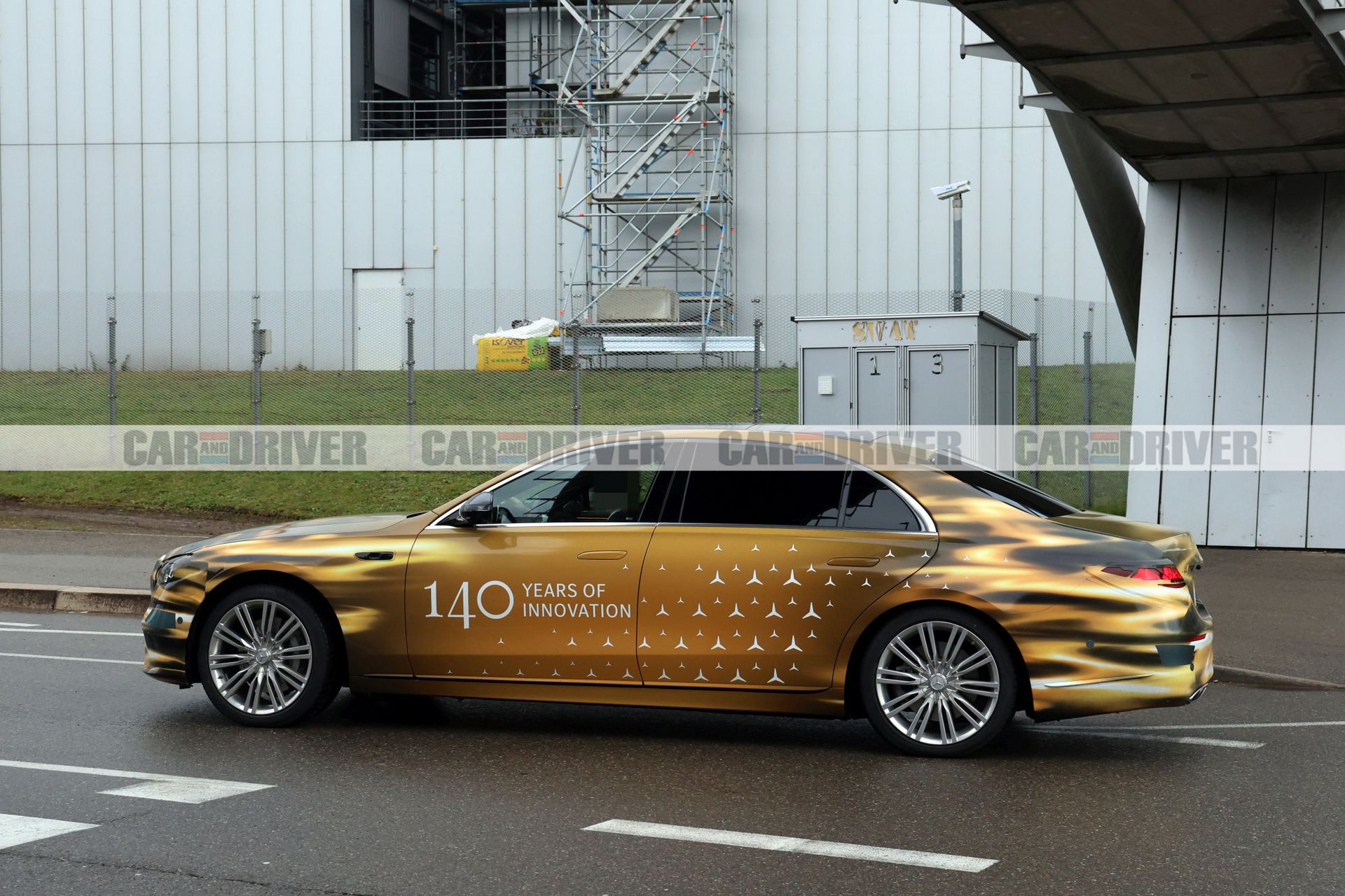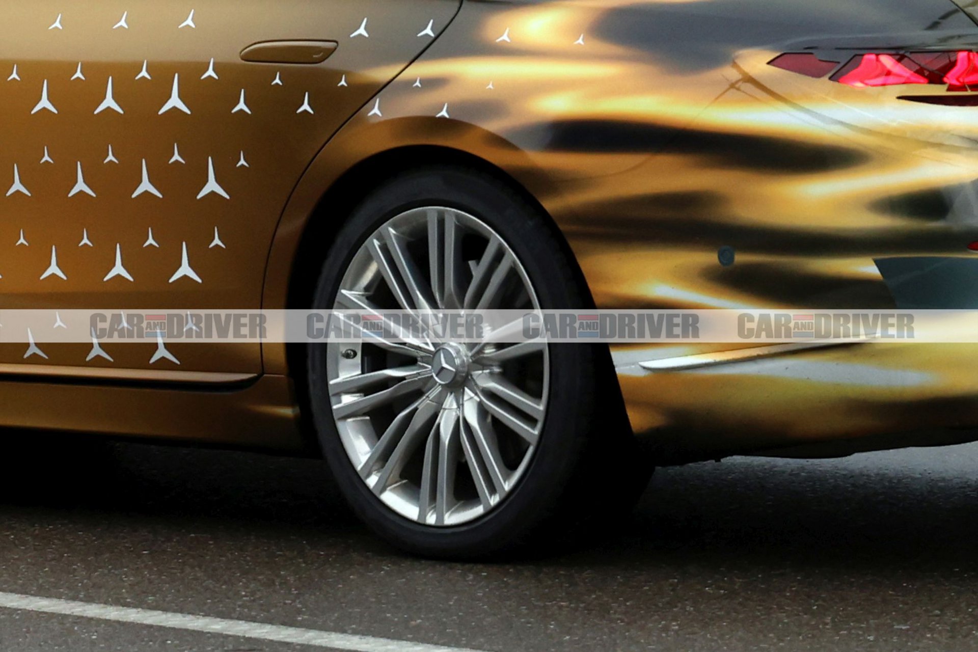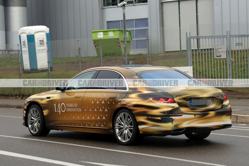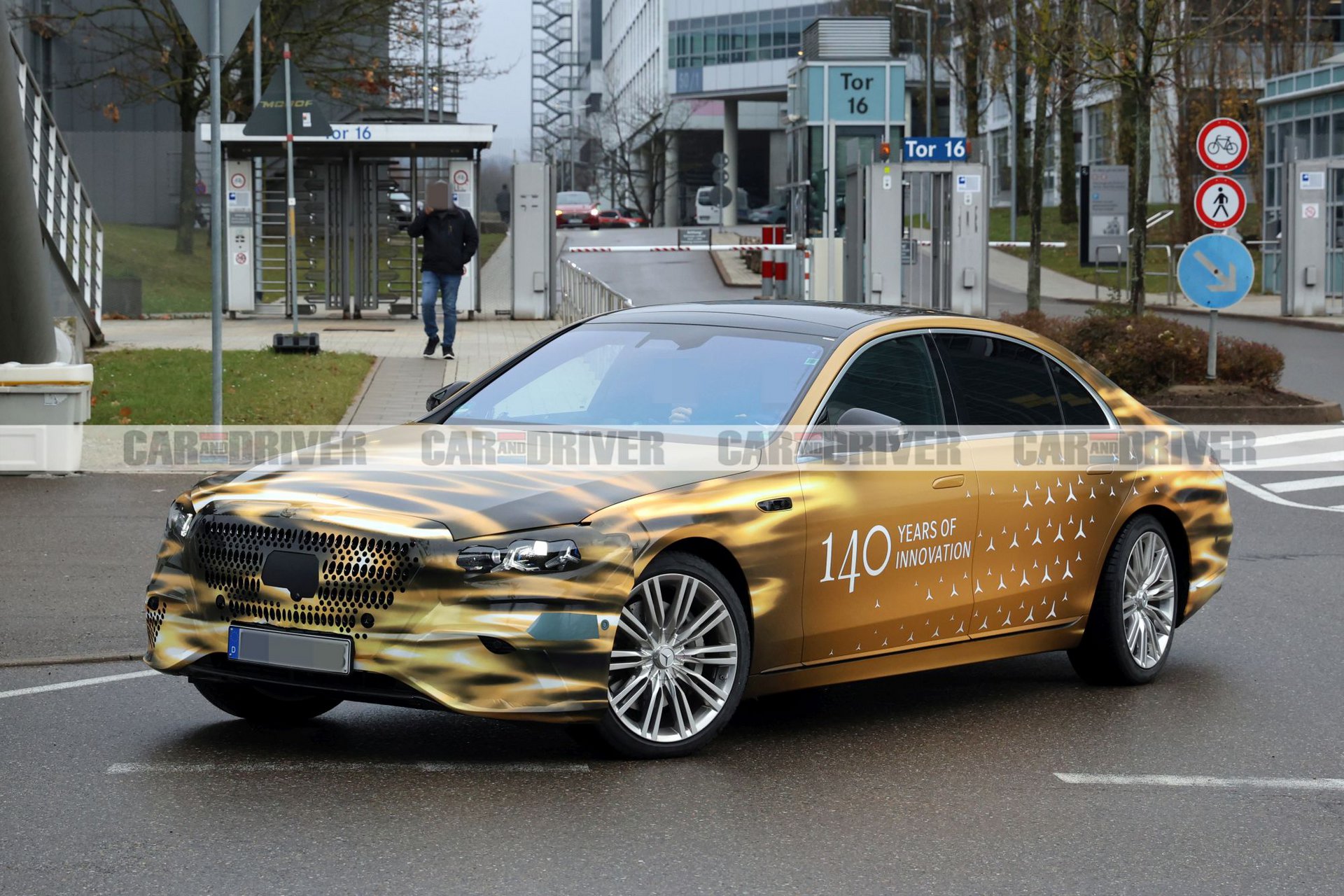 Οι συνεργάτες μας εντόπισαν πρόσφατα ένα πρωτότυπο που «παντρεύει» και τα δύο: την ανανεωμένη S-Class, «ντυμένη» με ένα εντυπωσιακό, επετειακό καμουφλάζ. Πρόκειται για ένα αυτοκόλλητο σε χρυσούς και μαύρους τόνους που γιορτάζει τα 140 χρόνια καινοτομίας της Mercedes, ενώ στο εμπρός και το πίσω μέρος υπάρχουν λεπτομέρειες που θυμίζουν φλόγες, κρατώντας τα σημεία αυτά καλά κρυμμένα.