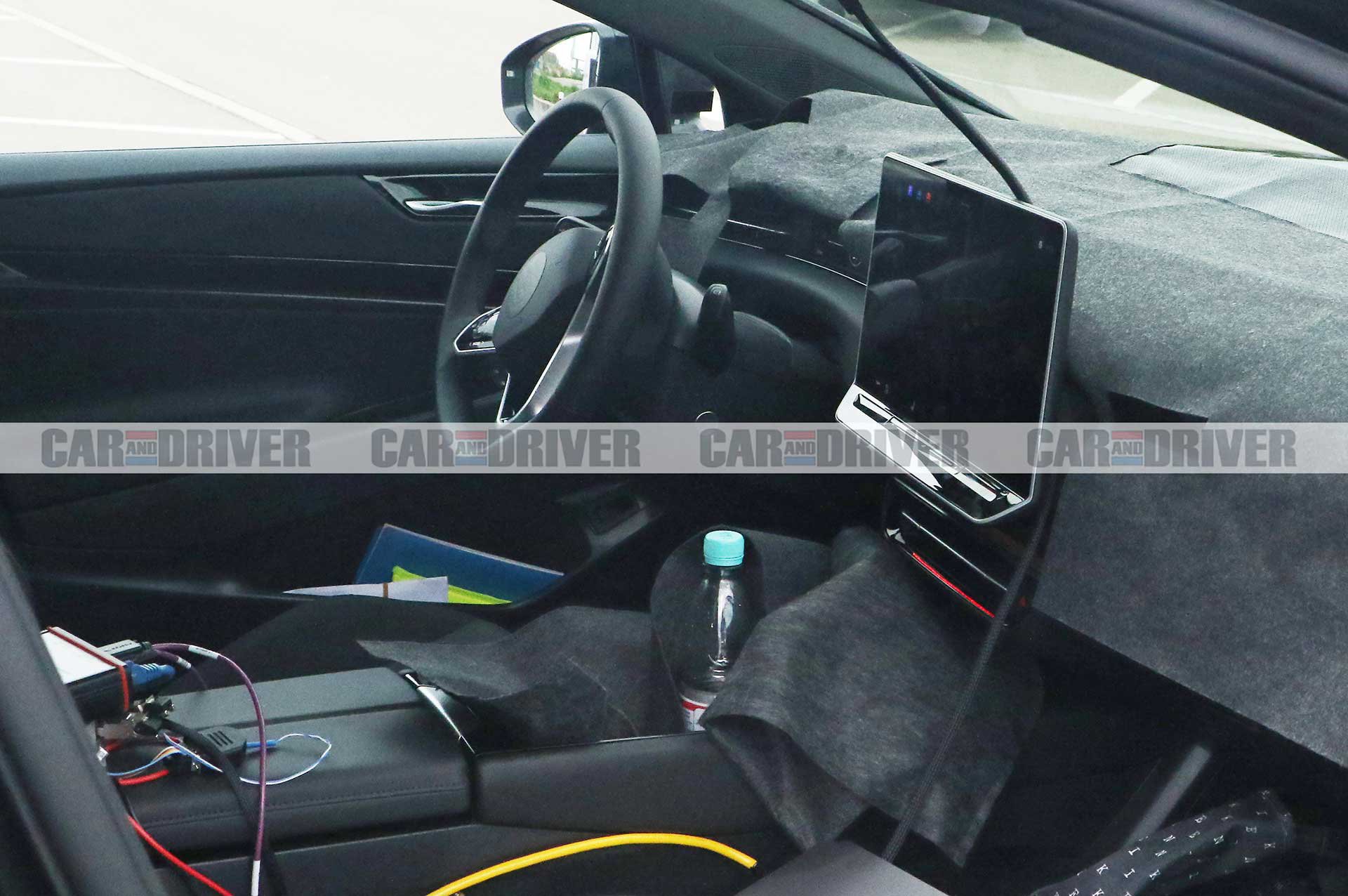 Μπορούμε να δούμε ξεκάθαρα τη νέα οθόνη infotainment που είναι τοποθετημένη στο κέντρο και θα είναι μεγαλύτερη σε σύγκριση με αυτή που είδαμε σε προηγούμενα μοντέλα ID. Η Volkswagen δείχνει να επιλέγει μια πιο premium εμφάνιση, με διακοσμητικά από αλουμίνιο και σατέν, όπως και δερμάτινες επενδύσεις.