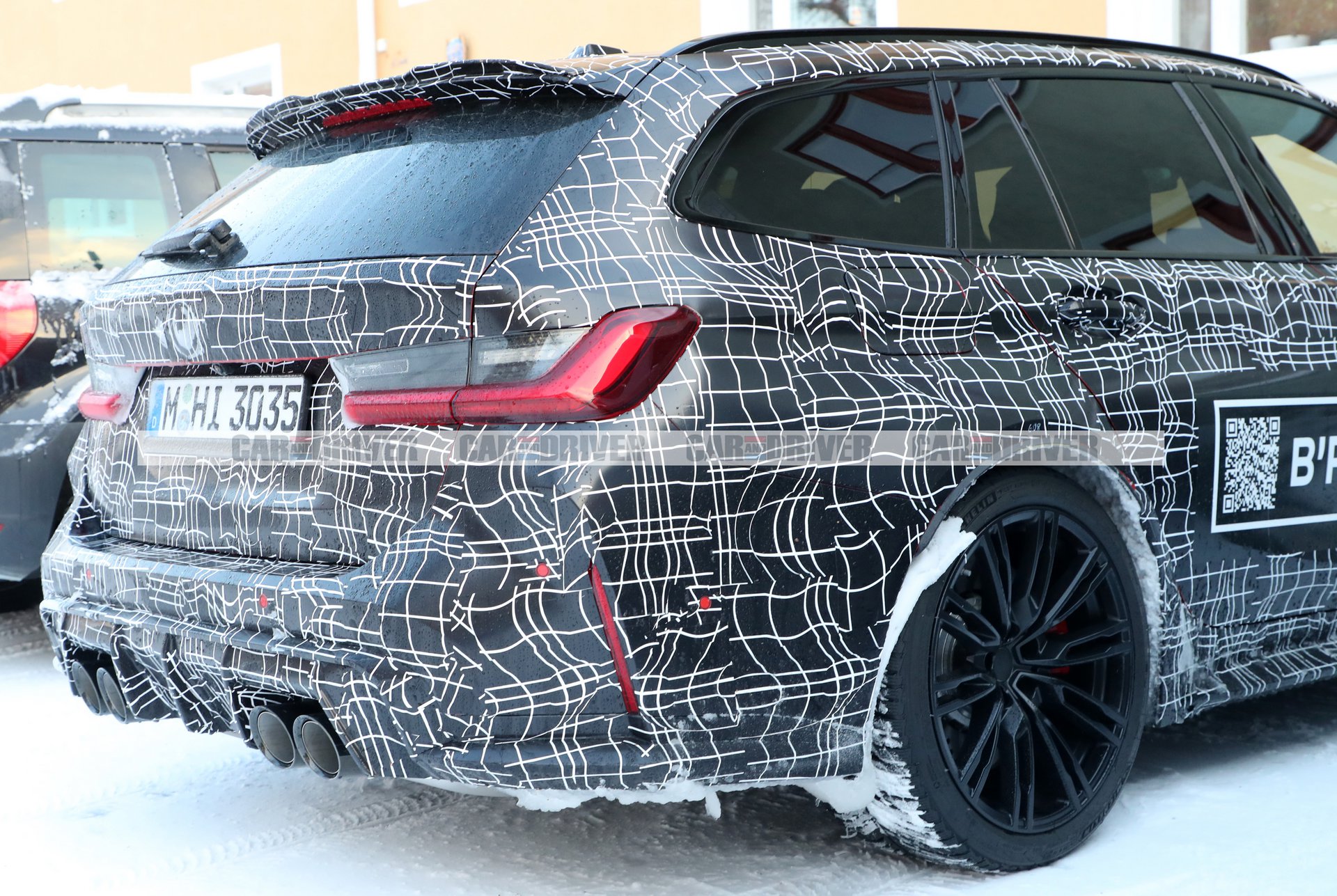 Όπως και τα άλλα πρωτότυπα της M3 Touring που έχουμε δει τον τελευταίο καιρό, και αυτό καλύπτεται από αρκετό καμουφλάζ, αλλά και πάλι μπορούμε να βγάλουμε πολλά συμπεράσματα για την εμφάνιση του. Οι πολύ λεπτές πολυάκτινες ζάντες μαζί με τις κόκκινες δαγκάνες των φρένων που κρύβονται από πίσω είναι τα δύο στοιχεία που κλέβουν την πρώτη ματιά του παρατηρητή. Στο πίσω μέρος ξεχωρίζουμε τις τετραπλές απολήξεις τις εξάτμισης και τα πίσω φώτα με το ορθογώνιο σχήμα.