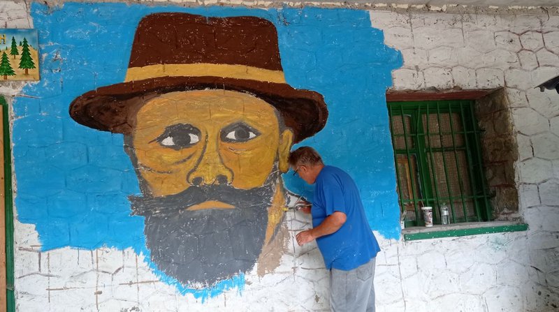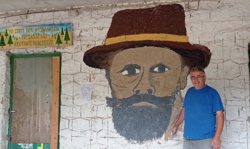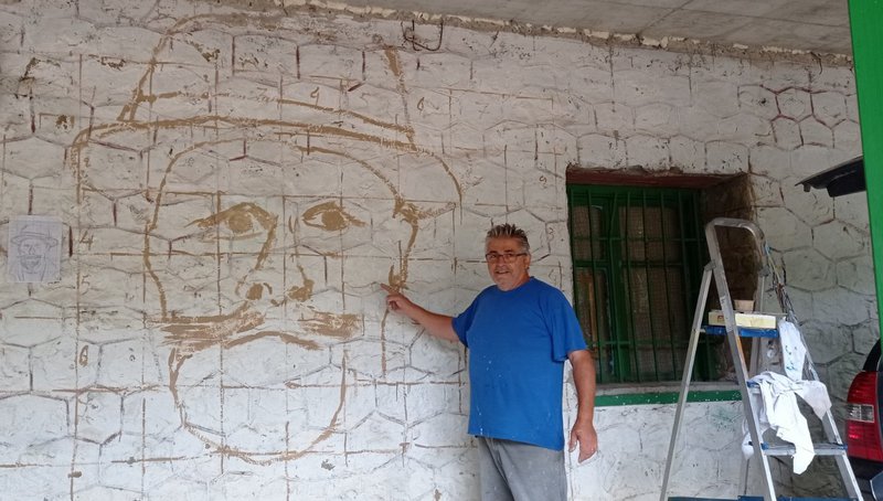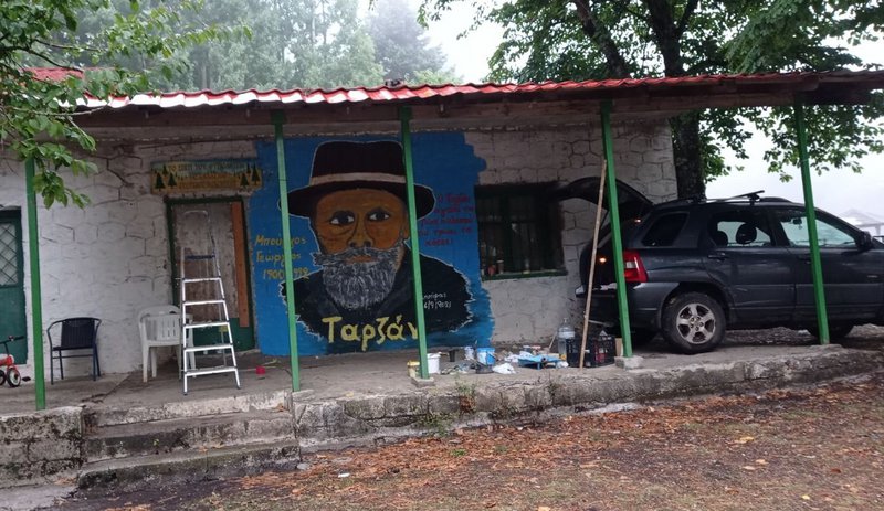 «Η απόφαση μου ήταν να κάνω την προσωπογραφία δίπλα σε ένα ξύλινο σπιτάκι του δασαρχείου, αφού δεν μπορούσα να βρω κάποιον από τους ιδιοκτήτες. Για καλή μου τύχη με βλέπει η κυρία Σοφία που ζούσε εκεί και με παρότρυνε να το φτιάξω πάνω στον συγκεκριμένο τοίχο, όπου και τελικά το έφτιαξα.