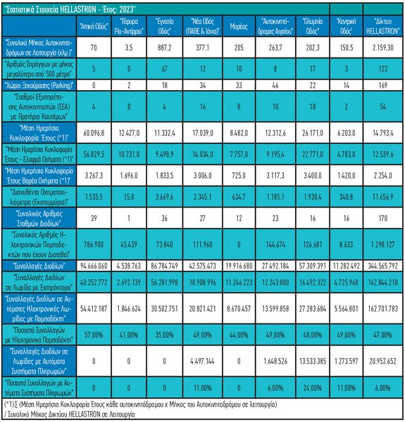 Μεγαλύτερος σε μήκος αυτοκινητόδρομος της χώρας είναι η Εγνατία Οδός, με 887,2 χλμ. και μικρότερος η Γέφυρα Ρίο-Αντίρριο, με 3,5 χλμ. Τη μεγαλύτερη πυκνότητα σε Σταθμούς Εξυπηρέτησης Αυτοκινητιστών (ΣΕΑ) με Πρατήριο Καυσίμων παρουσιάζει η Ολυμπία Οδός, η οποία διαθέτει και τη μεγαλύτερη μέση ημερήσια κυκλοφορία έτους (26.171), μεταξύ των μη αστικών αυτοκινητοδρόμων, καθώς την πρώτη θέση στους αστικούς αυτοκινητοδόμους καταλαμβάνει η Αττική Οδός (60.096,78). Προσέξτε ότι ενώ η Εγνατία Οδός καταλαμβάνει την προτελευταία θέση ως προς την μέση ημερήσια κυκλοφορία, βρίσκεται μπροστά από όλους ως προς τα διανυθέντα οχηματοχιλιόμετρα (3.669,55 εκατομμύρια), κάτι που οπωσδήποτε σχετίζεται με το μήκος της.