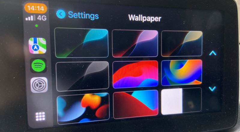 Για πρώτη φορά, το Apple CarPlay είναι πλέον εξατομικεύσιμο. Η Apple προσφέρει μια σειρά από ταπετσαρίες, τις οποίες μπορεί κανείς να επιλέξει μέσω των Ρυθμίσεων > Ταπετσαρίες (ή Wallpapers, αν η γλώσσα είναι ρυθμισμένη στα Αγγλικά, όπως στην παραπάνω εικόνα).
