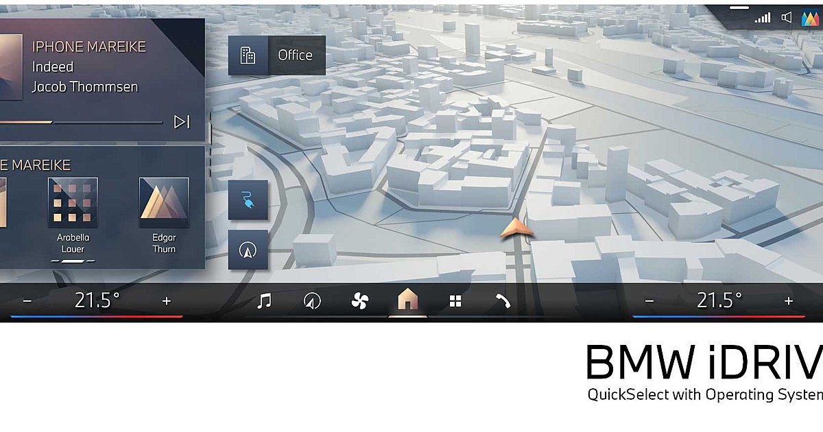 Το νέο BMW iDrive με QuickSelect αποτελεί περαιτέρω εξέλιξη του BMW Operating System 8 που τοποθετείται στα τρέχοντα μοντέλα BMW με BMW Curved Display και βασίζεται στις νέας γενιάς infotainment των κεντρικών μονάδων, που είναι επίσης υπεύθυνες για την επεξεργασία γραφικών.