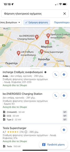 Στη συνέχεια, αφού εμφανιστούν οι πλησιέστεροι στην τοποθεσία σας φορτιστές, επιλέγοντας 'Γρήγορη Φόρτιση', η εφαρμογή θα αποκλείσει όσους φορτιστές προσφέρουν λιγότερο από 50 kW, εμφανίζοντας μόνο τους διαθέσιμους ταχυφορτιστές. Δίνεται επίσης η δυνατότητα επιλογής τύπου βύσματος, μεταξύ Tesla, CCS 1, CCS 2, J1772, Type 2, CHAdeMO, αλλά και επιτόχιας πρίζας.