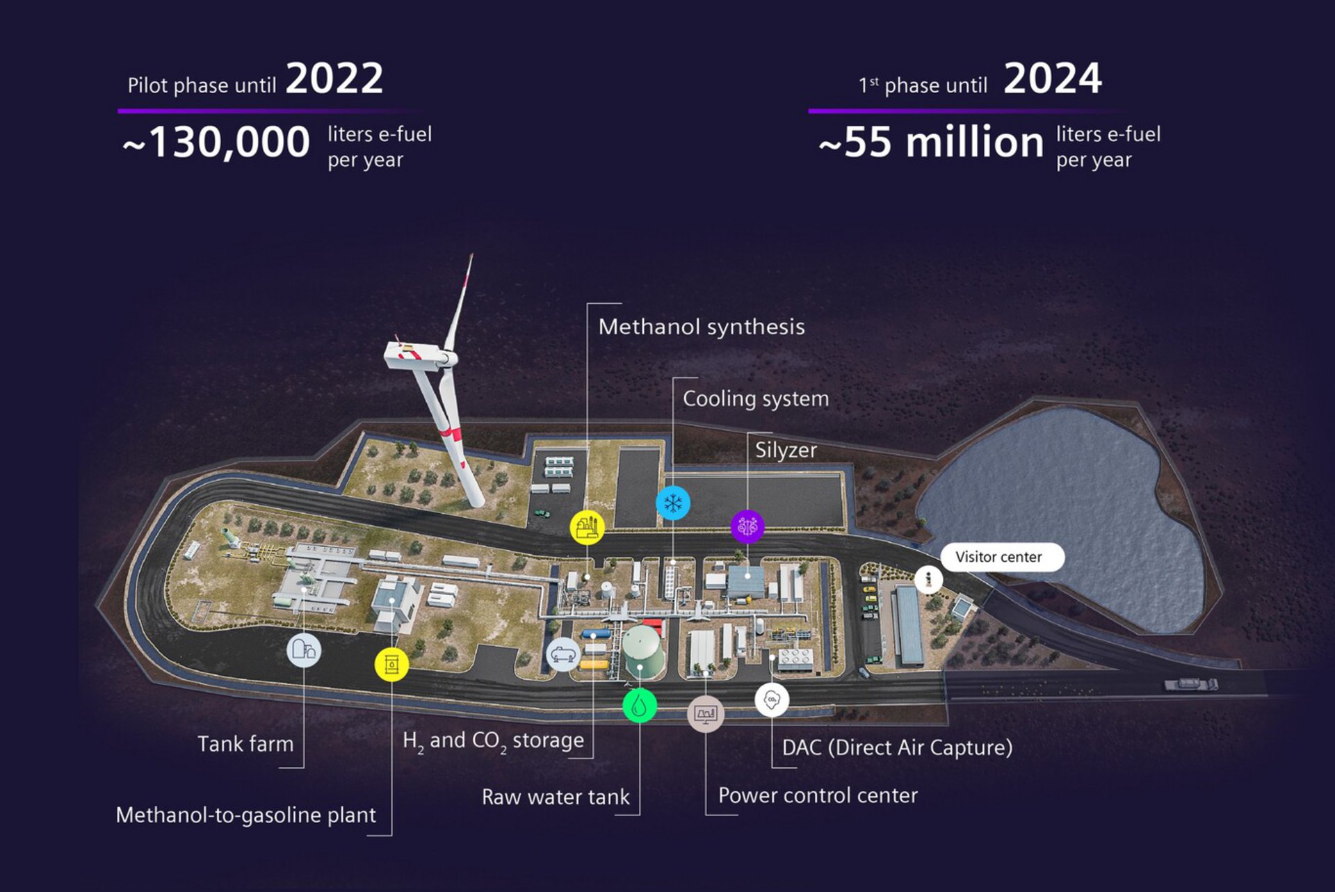 Το πιλοτικό εργοστάσιο θα παράγει περίπου 130.000 λίτρα ηλεκτρονικών καυσίμων το επόμενο έτος και αργότερα θα επεκτείνει τη χωρητικότητά του σε 55 εκατομμύρια λίτρα σε ένα πρώτο στάδιο το 2024 και σε περίπου 550 εκατομμύρια λίτρα το 2026.