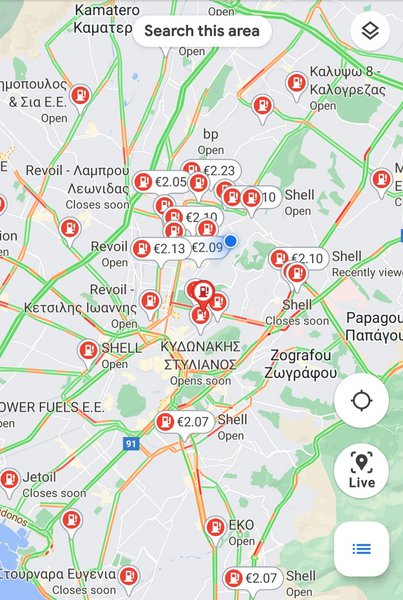 Πατώντας πάνω της εμφανίζονται γύρω από την περιοχή που βρίσκεστε τα πλησιέστερα σημεία, ενώ «ανοίγοντας» τον χάρτη οι επιλογές αυξάνονται. Δίπλα από κάθε πινέζα που αντιστοιχεί σε κάθε πρατήριο εμφανίζεται live η τιμής της αμόλυβδης (SP95). Αν θέλετε να μάθετε τις τιμές και των άλλων καυσίμων θα πρέπει να πατήσετε πάνω στην πινέζα και μέσα από το αναδυόμενο πλαίσιο θα βρείτε τον πλήρη τιμοκατάλογο.