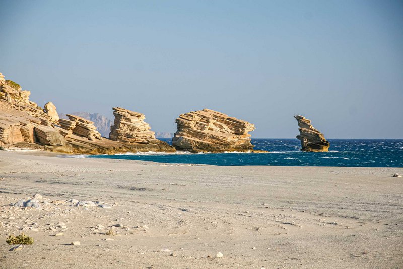 Από το Αμμούδι ξεκινά ένας παραλιακός, στενός, αλλά ασφαλτοστρωμένος πλέον, δρόμος που σου επιτρέπει κινηθείς προς τα ανατολικά, προς την πλευρά της Αγίας Γαλήνης. Στη διαδρομή, στα δεξιά σου εναλλάσσονται μικρές και μεγάλες παραλίες, πάντα στη σκιά του όρους Σιδερώτα: Αγ. Ειρήνη, Αγ. Φωτεινή, Λίγκρες για να βρεθείς κάποια στιγμή αντιμέτωπος με την εντυπωσιακότατη Τριόπετρα και να καταλάβεις σε ποιον οφείλει το όνομά της. Πρόκειται για τους τρεις χαρακτηριστικούς βράχους – σύμβολο της μεγάλης παραλίας. Λίγο μετά ακολουθεί το υπερθέαμα των αμμόλοφων της παραλίας του Αγίου Παύλου. Το πόσο μακριά θα φτάσεις έχει να κάνει με τον χρόνο που έχεις στη διάθεσή σου.