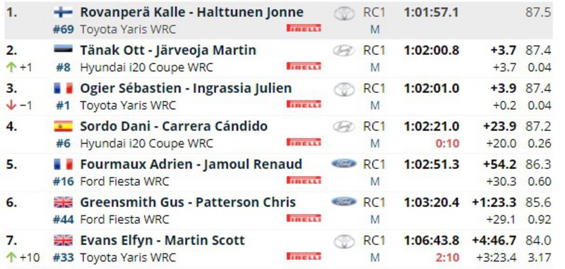 Ακόμα πιο κλειστή είναι η διαφορά Ott Tanak-Sebastien Ogier. Ο Γάλλος είχε καταφέρει να περάσει δεύτερος μετά την SS5 Θήβα (τη μεγαλύτερη της μέρας), προτού χάσει την θέση από τον οδηγό της Hyundai για μόλις 0,2 δλ.