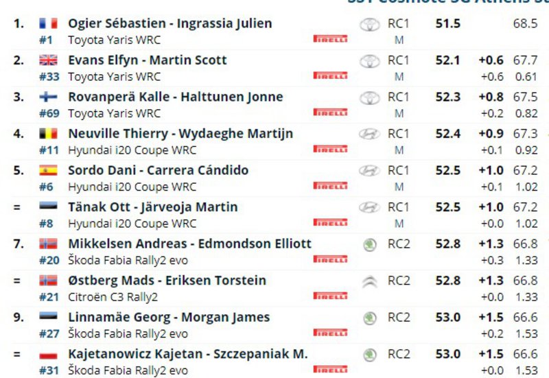 Τρίτος ήρθε ο Kalle Rovanpera, και αυτός με Toyota Yaris WRC, μόλις 0,1 δλ. μπροστά από τον Thierry Neuville, το πρωτοπόρο Hyundai i20 Coupe WRC.