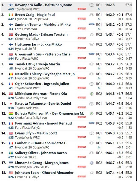 Τον ακολούθησε ο Craig Breen της Hyundai, με διαφορά μόλις 0,1 δευτερολέπτου, ενώ λίγο έλειψε να τους περάσει και τους δύο ο Teemu Suninen, που όμως έκανε λάθος και έχασε πολύτιμο χρόνο, μένοντας τρίτος.