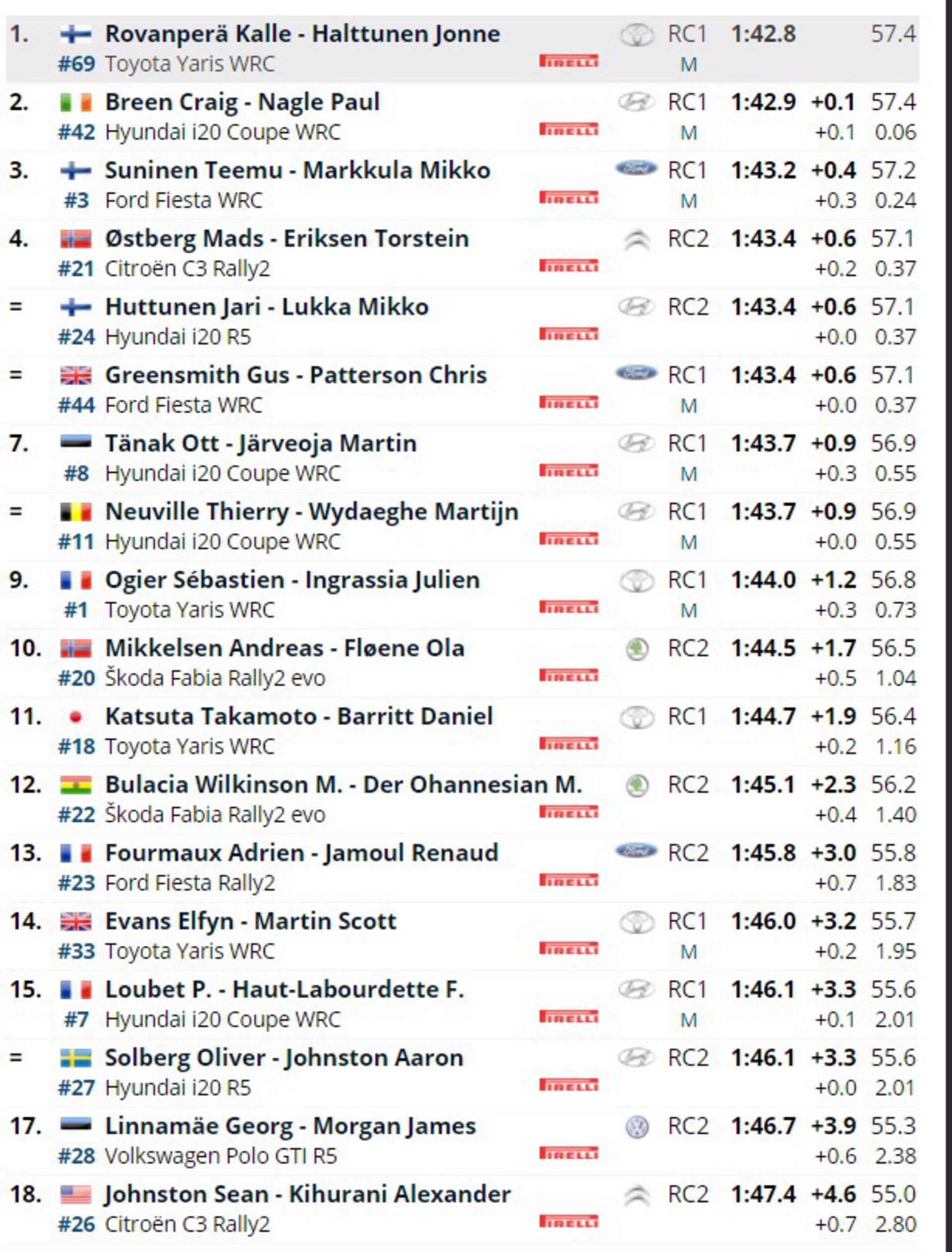 Τον ακολούθησε ο Craig Breen της Hyundai, με διαφορά μόλις 0,1 δευτερολέπτου, ενώ λίγο έλειψε να τους περάσει και τους δύο ο Teemu Suninen, που όμως έκανε λάθος και έχασε πολύτιμο χρόνο, μένοντας τρίτος.