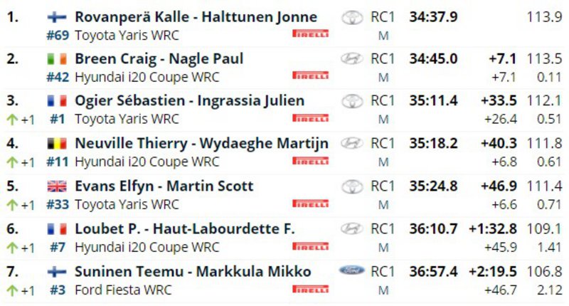 Από την Toyota, τα πράγματα πήγαν καλά και για τον Sebastien Ogier, ο οποίος αναρριχήθηκε 3ος με τις εγκαταλείψεις και τα προβλήματα των υπολοίπων. Ο Elfyn Evans έχασε χρόνο στην SS3 και έπεσε πίσω από τον Neuville.