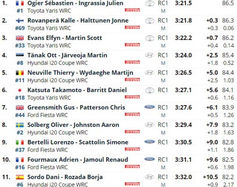Την τριάδα έκλεισε ακόμα ένα Yaris WRC, αυτό του Elfyn Evans, 0,7 δλ. μακριά από τον Γάλλο πρωταθλητή.