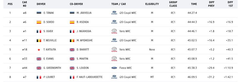 Πίσω του ο Dani Sordo, για το 1-2 της Hyundai, ο οποίος με τη σειρά του κρατούσε τρίτο τον Sebastien Ogier για 1,8 δλ. Ο Γάλλος οδηγός της Toyota ξεκινούσε πρώτος στις ε.δ., «καθρίζοντας» τον δρόμο, και με δεδομένο αυτό, η ταχύτητά του ήταν εξαιρετική.