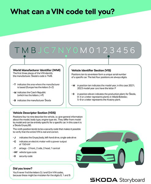 «Στα αυτοκίνητα Skoda, αυτό το τμήμα του VIN χρησιμοποιείται για τον προσδιορισμό του τύπου αμαξώματος, του κινητήρα, των πληροφοριών σχετικά με τα δομικά συστήματα του αυτοκινήτου και του τύπου του αυτοκινήτου. Στην περίπτωση των ηλεκτρικών αυτοκινήτων Skoda Enyaq, η πέμπτη θέση του VIN μπορεί να χρησιμοποιηθεί για να μάθετε την απόδοση του συστήματος μετάδοσης κίνησης», εξηγεί ο Vasina. Έτσι, το γράμμα A αντιπροσωπεύει ένα αυτοκίνητο Skoda με ισχύ 148 PS, το γράμμα Β για 179 PS, το C για 204 PS, το Ε για 265 PS και το F για 300 PS.